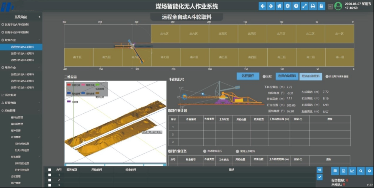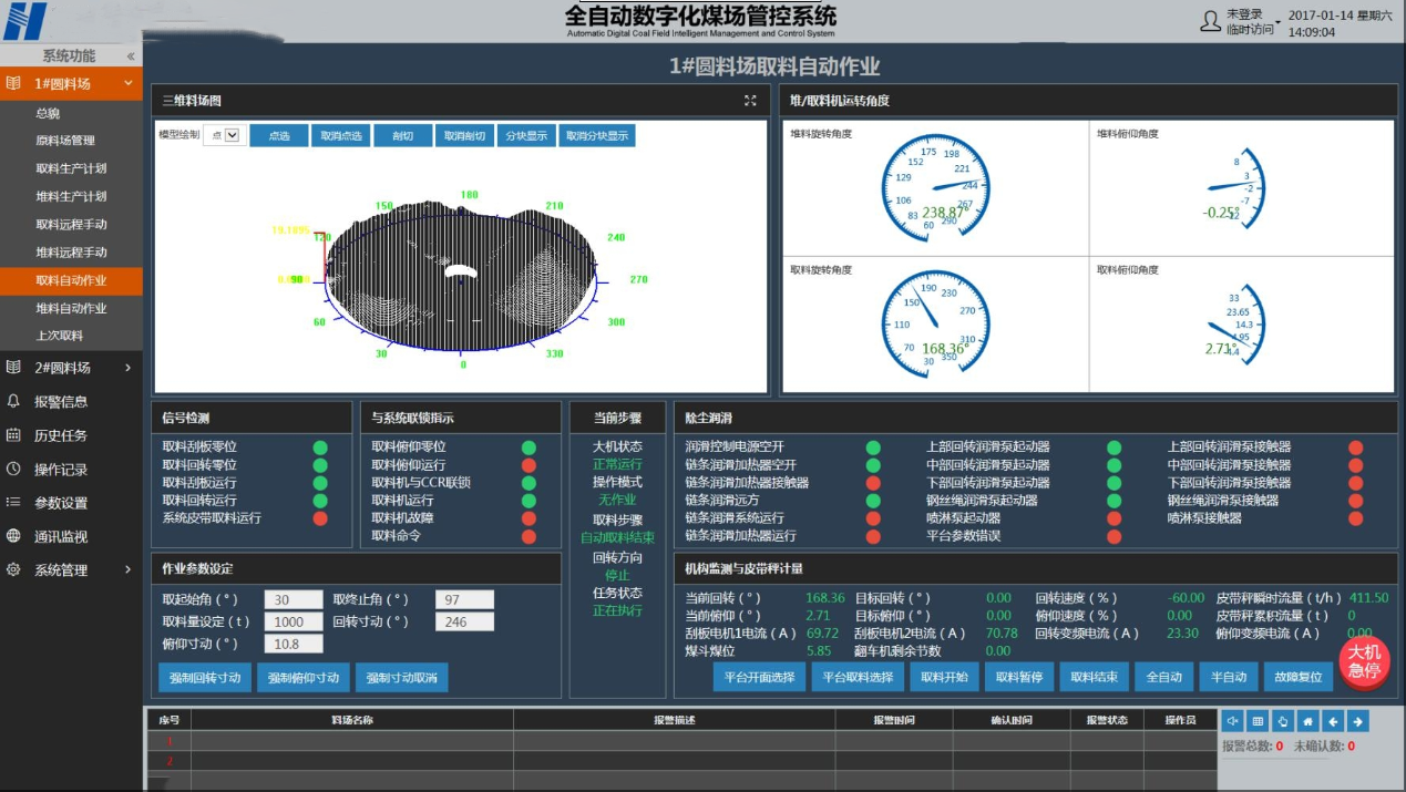 系统包括:堆料与取料全自动作业操控,智能巡护盘料,料场3D可视化管理,堆料与取料作业计划管理,取料流量控制,多重安全防护、报警信息查询,操作记录等主要功能。